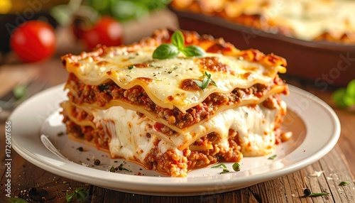 Savory Lasagna Delight: A close-up shot showcases a hearty serving of lasagna, featuring layers of savory meat sauce, creamy cheese, and tender pasta sheets, ready to be savored.