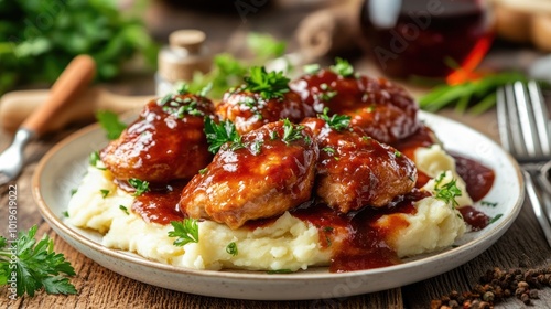 meatball, mashed potatoes, sauce, dinner, comfort food, parsley, plate, home cooking, wooden table, rustic, epicure, delicious, culinary, herb, tasty, meal, hot, savoury, kitchen, dining, homemade, wholesome, appetising, cookery, side dish, garnish, traditional, fork, knife, eatery, food photography, chef, fresh, ready to eat, simple, hearty, receipe, eating, nourishment, dining table, presentation, favor