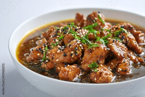 Savory sesame oil chicken stew with tender chicken pieces and aromatic herbs on a white background