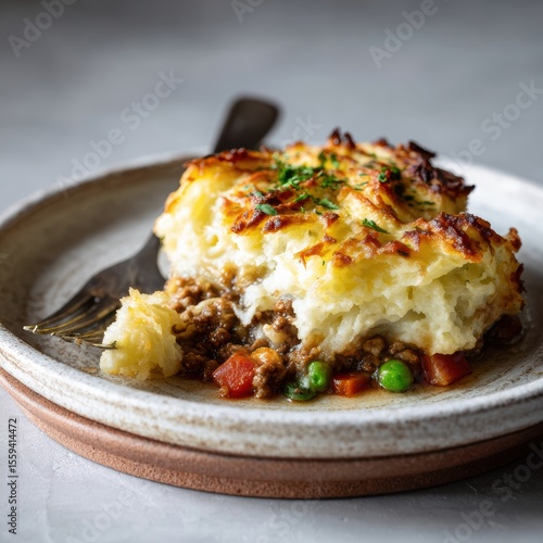 pie, shepherd, meat, potato, mashed, food, dish, lunch, cookery, dinner, meal, rustic, delicious, fresh, ingredient, baked, homemade, plate, fork, parsley, brown, carrot, pea, tomatoes, tasty, cooked, vegetable, topping, gold, crust, savoury, portion, single, table, top, culinary, deliciously, filling, european, british, warm, ground, beef, sheep, mincemeat, alimentary