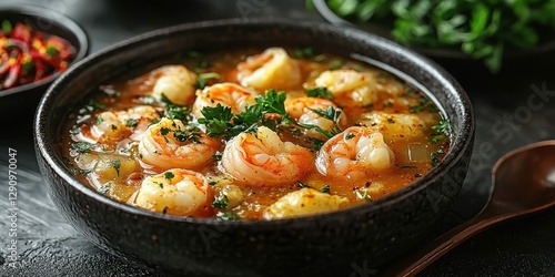 Savory Shrimp and Vegetable Stew in a Dark Bowl Garnished with Herbs Ready to Eat Closeup