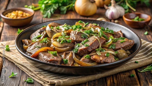 Savory Slices of Braised Meat, Mushrooms, and Onions Garnished with Fresh Herbs in a Rustic Setting