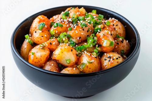 Savory spiced baby potatoes garnished with green onions and sesame seeds delightfully presented