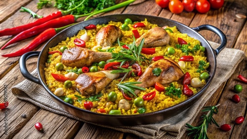 savoury, traditional, spanish, paella, dish, loaded, succulent, chicken, flavorful, saffron, infused, rice, vibrant, vegetable, rustic, wooden, table, mediterranean, casserole, accessing, main, course, dinner, aromatic, gold, brown, golden brown, cooked, perfectly, crispy, tender, juicy, mouth-watering, appealing, mouth-watering, appetising, homemade, classic, authentic, delicious, delightful, opulent, sumptuousness