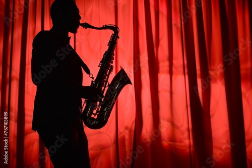 saxophonist silhouette against red curtain