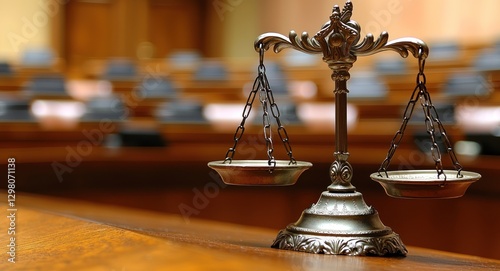 Scales of Justice in Courtroom: Symbol of Law, Fairness, and Equity