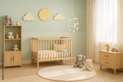 baby, childcare center, crib, mint, cream, yellow, soft, plush, toy, rug, wood, cosy, peaceful, natural, light, window, pastel, mobile, decor, scandinavian, minimalist, cushion, lamp, bookshelf, curtain, room, interior, bedchamber, bed, furniture, home, house, children, indoor, inside, children