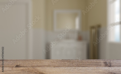 Scandinavian bathroom, classic vintage interior design. 3D rend. Background with empty wooden table. Flooring.