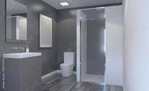 Scandinavian bathroom, classic vintage interior design. 3D rendering. Blank paintings