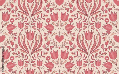 scandinavian, folk art, tulip, heart, flower, floral, pattern, seamless, romantic, love, pink, beige, design, illustration, background, texture, wallpaper, textile, fabric, print, vector, art, style, graphic, element, decorative, pretty, delicate, elegant, feminine, pastel, spring, summer, blossom, bloom, nature, botanical, vintage, retro, whimsical, charming, cute, sweet, card, invitation, wedding, celebration, holiday, valentine