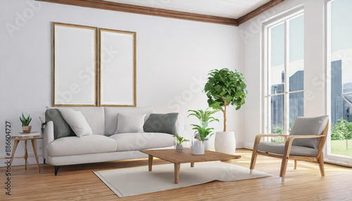 Scandinavian interior poster mock up with horizontal wooden frames, light grey sofa on wooden floor, wooden side table and green plant in living room with white wall. 3d illustrations.