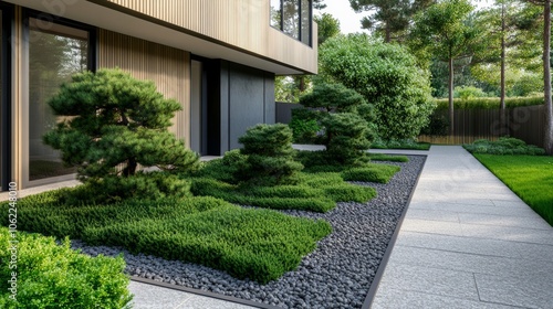 Scandinavian style garden with Pine, spruce, low-growing coniferous trees, in the courtyard of the house