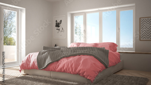 Scandinavian white and pink minimalist bedroom with panoramic window, fur carpet and herringbone parquet, modern pastel architecture interior design