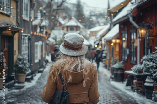 Scandinavian woman in a fashionable coat, browsing local shops in a quaint Nordic village, Scandinavian travel, shopping adventure.