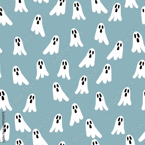 scared ghosts on a blue background, simple pattern for printing on tnani, halloween background with white ghosts