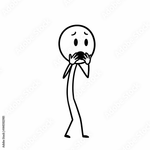 stick figure, covering, mouth, feeling, shocked, scared, hand, expression, frightened, surprise, cartoon, panic, emotion, fear, anxiety, isolated, white, simple, graphic, drawing, illustration, concern, stress, worried, facing, forward, upset, standing, minimalist, design, character, line, art, outline, abstract, comic, symbol, icon, clip art, afraid
