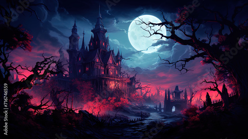 moon, night, halloween, sky, tree, house, landscape, castle, illustration, silhouette, black, dark, light, scarey
