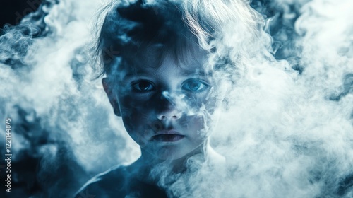 Scary child face in industrial smoke close up focus on copy space haunting vivid hues double exposure silhouette with pollution theme..