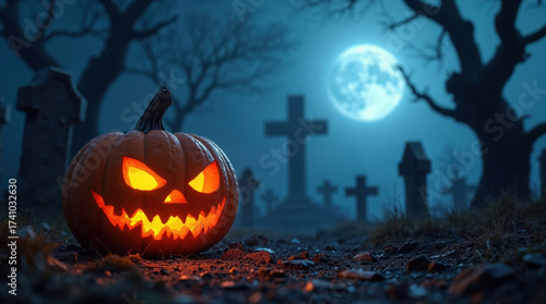 Scary jack o lantern pumpkin with an evil face in spooky cemetery at night for creepy halloween celebration