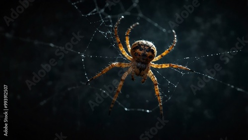 Scary spider with a cobweb on a dark background.