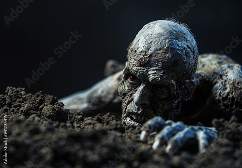 Scary zombie crawling out of the ground. Black background. Undead, creepy monster. Halloween and horror concept.