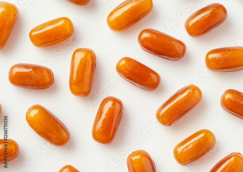 Scattered amber candies on white, overhead shot, food photography, packaging design