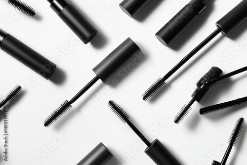 mascara, black, tube, cosmetic, make-up, beauty, product, scattered, white, background, arrangement, cosmetic, eye, lash, dark, elegant, stylish, modern, minimal, simple, clean, design, texture, pattern, aesthetic, photo, still life, image, illustration, graphic, visual, object, item, accessory, tool, application, care, enhancement, style, look, effect, impact, professional, premium