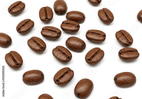 Scattered coffee beans on a white surface creating a simple and clean food and drink still life shot
