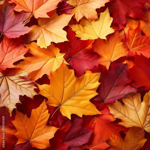 Scattered colorful red, orange and yellow fall maple leaves background. Colors of gold autumn. Seasonal decoration concept.