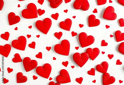 Scattered red hearts of varying sizes on white background, image, pretty