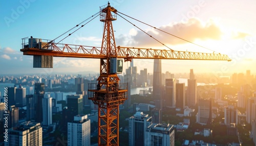 Scene of large crane lifting skyscraper steel structure, modern city background