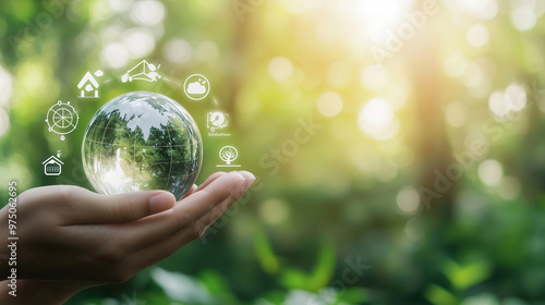 scene with hands holding a small globe, surrounded by icons representing sustainable development goals such as renewable energy, clean water, and forest conservation. The backdrop