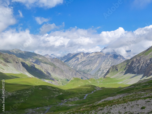 Scenic alpine hiking trail with panoramic view of mountains and hills in valley Valle Stura in Colle Del Puriac, Piemonte, Italy, Europe. Mtb tour in Italian Alps in summer. Peaceful serene atmosphere