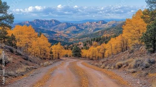 road, autumn, fall, tree, landscape, nature, mountain, yellow, gold, leaf, dirt, path, scenic, view, travel, adventure, wilderness, forest, foliage, colours, vibrant, beautiful, sky, cloud, hill, vale, aspen, sunlight, season, picturesque, calmness, serenity, environment, country, rural, remote, destination, exploration, discovery, majestic, panorama, vista