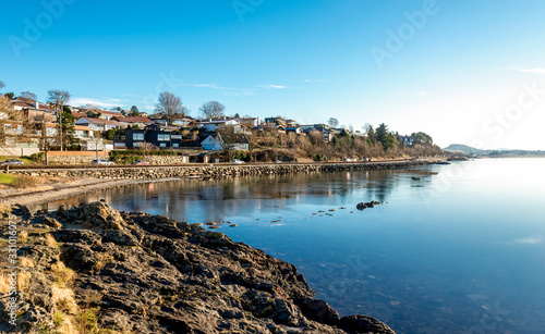 Scenic coastal view of Hafrsfjord bay covered by thin ice and residential houses of the suburb near Sword in Rock monument, Stavanger, Norway, February 2018