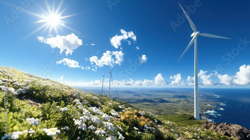 wind, energy, coastal, landscape, nature, sky, cloud, sunlight, green, environment, sustainability, power, earth, technology, renewable, field, flower, fresh, blue, horizon, clean, environmentally friendly, windmill, region, hill, wind farm, aerial, clear, bright, summer, electricity, beauty, scenic, natural, vista, power generation, clean energy, eco, wind power, earth science