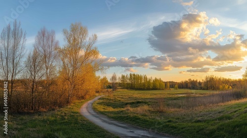 landscape, nature, sunset, sky, cloud, field, tree, road, path, evening, golden hour, spring, rural, countryside, grass, sunlight, scenic, idylli, tranquil, peaceful, beauty, horizon, panorama, open space, serene, birch, rural scene, winding road, scenic view, soft light, seasonal