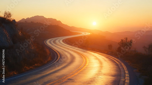 Scenic curved highway asphalt road with golden sky and mountain in the sunset