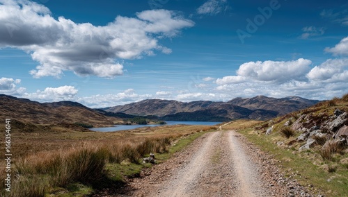 Scenic dirt road winding through a Scottish valley, leading to a loch. Vast open spaces and rolling hills. Clear blue sky with puffy white clouds. A peaceful and tranquil scene