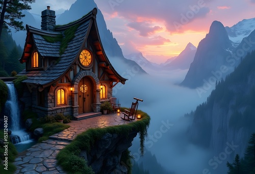 Scenic fantasy cottage perched on a cliff overlooking dramatic mountain landscape at sunset