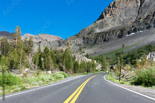 Scenic Highway 108 road running through Sierra Nevada mountain scenery on a sunny summer day in summer near Sonora Pass
