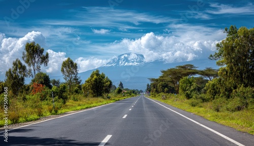 highway, road, mountain, cloud, sky, tree, landscape, scenic, sunlight, nature, vista, horizon, travel, african, lush, green, grass, asphalt, white, line, peak, snow, cloudscape, bright, sunny, pathway, open, huge, expansive, journey, summer, view, distance, elevation, perspective, natural, africa, route, trip, beauty, destination, roomy, tranquil, panorama