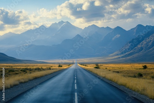 road, highway, mountain, range, landscape, nature, travel, sky, cloud, horizon, journey, destination, adventure, wilderness, scenic, huge, freedom, open, empty, asphalt, perspective, distance, long, straight, blue, white, yellow, brown, green, beautiful, majestic, peaceful, tranquil, mountain, sun, light, way