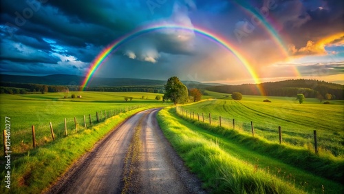 Scenic Landscape: Post-Rain Rainbow over Country Road and Lush Green Fields with Bokeh