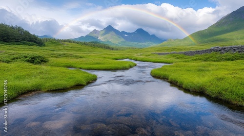 Scenic landscape with rainbow over mountain and lush green valley reflected in stream