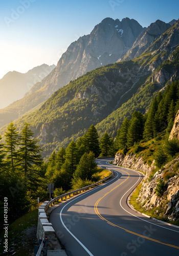 mountain road, winding road, sunrise, morning light, nature, travel destination, adventure, road trip, serene, peaceful, calmness, journey, escape, freedom, picturesque, wanderlust, natural beauty, vacation spot, mountain pass, scenic route, fresh air, landscape, sun, culture, sky