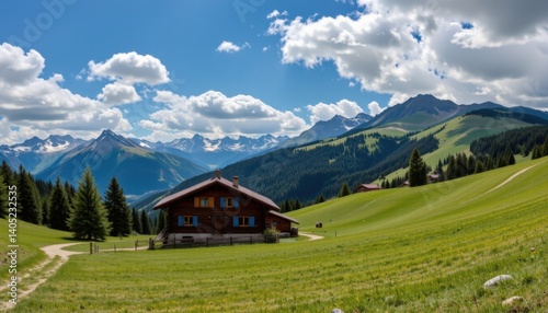 Scenic mountain landscape with cozy cabin alpine region nature photography daytime panoramic view