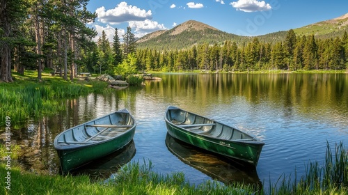 Scenic Mountain Landscape with Two Rowboats Anchored by a Serene Lake Surrounded by Lush Forest and Reflections