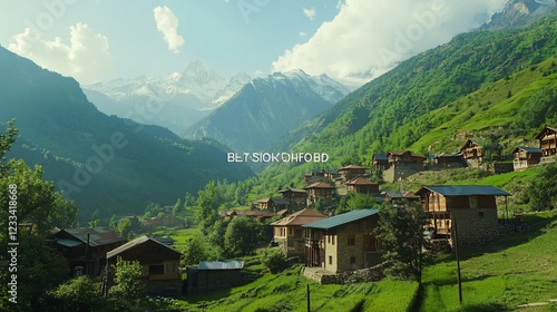 Scenic mountain village nestled amidst lush green hills with snow capped mountains in the background