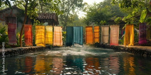 fabric, dyeing, workshop, colourful, fabric, hanging, dry, sunlight, river, hand-made, craft, artisan, traditional, textile, art, dye, process, creative, vibrant, scene, craftsmanship, culture, handcraft, local, artisanal, drying, hue